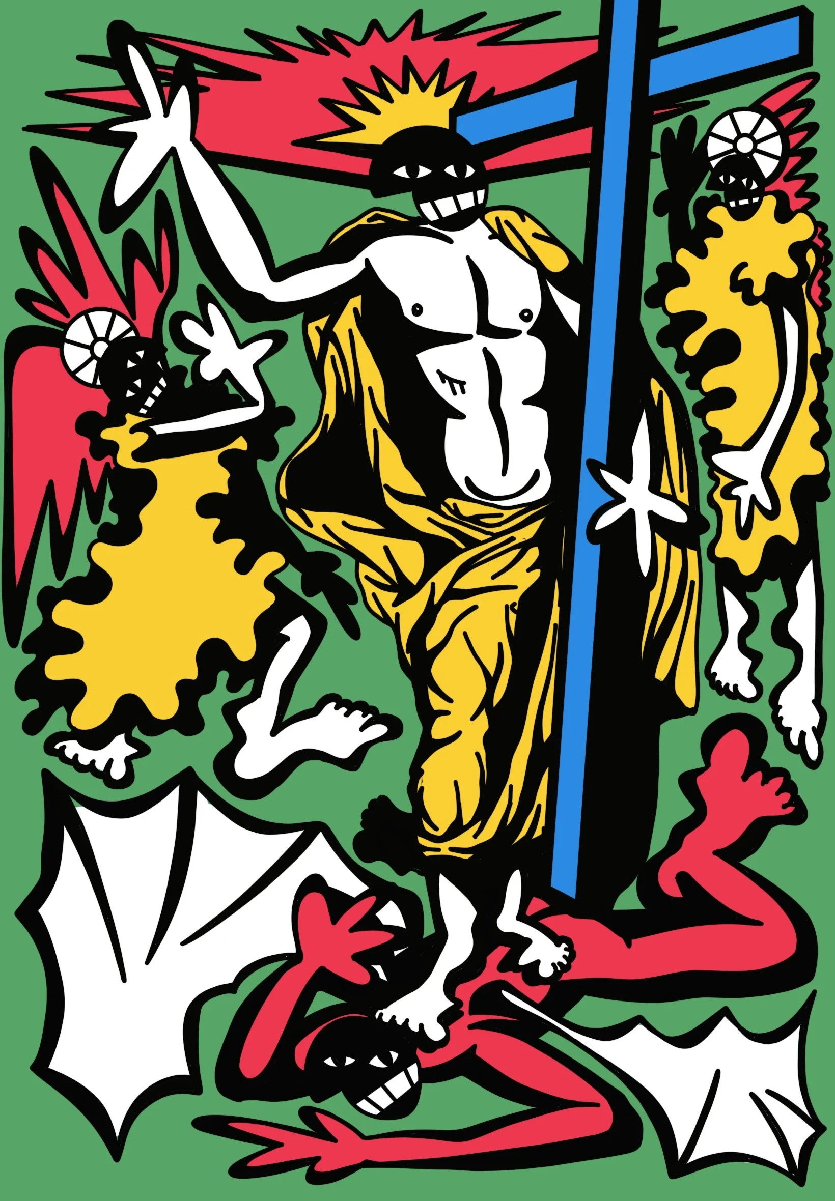 For millennia the Catholic Church has fostered an identity of consumption, influence, and moral authority to the globe, acting as a ‘savior.’ And, for less than millennia, the American Machine has done the same thing. In my practice, focusing on illustrations, I maintain compositions, imagery, and narratives of classical works of Renaissance and Baroque masters, while infusing modern styles. Much of my work replaces common Catholic motifs with those found in American culture. Drawing inspiration from the street art lining subway stations, abandoned buildings, and highway billboards, my work uses bold colors, thick lines, and two-tone shading. This style creates work that feels satirical and stands as an anti-culture towards ideas of the classical art world. Work that critiques the elitist culture preserved by the Catholic Church and its good friend, the American Culture. Through sculpture and collage, I continue to work in satirical comparison. Often adorning traditional catholic items with icons of Americana. Or, vice versa (I am aware of the eternal damnation that awaits me for this blasphemy). These pieces stand as physical representations of the consumerist and capitalistic backbone in which these institutions were born, and continue to operate under. My practice stands to explore the parallelity between Catholicism and “American-ism.” A parallelity that follows two institutions built upon imperialistic & colonialistic histories disguised as ‘peace-bringers.’ Through my work, I hope to highlight the commonality and hypocrisy of two institutions long entangled with political and cultural structures that perpetuate inequality and injustice.