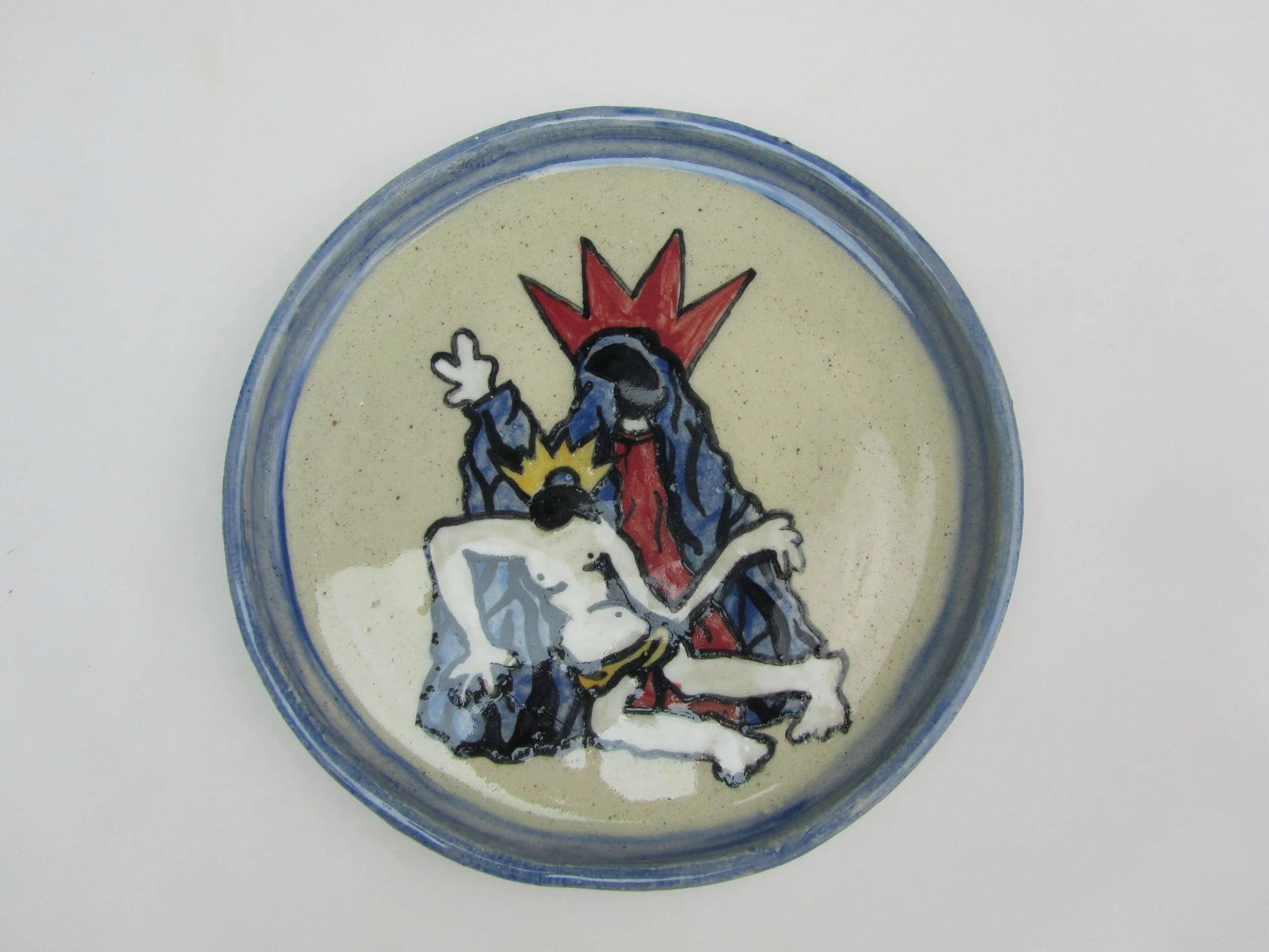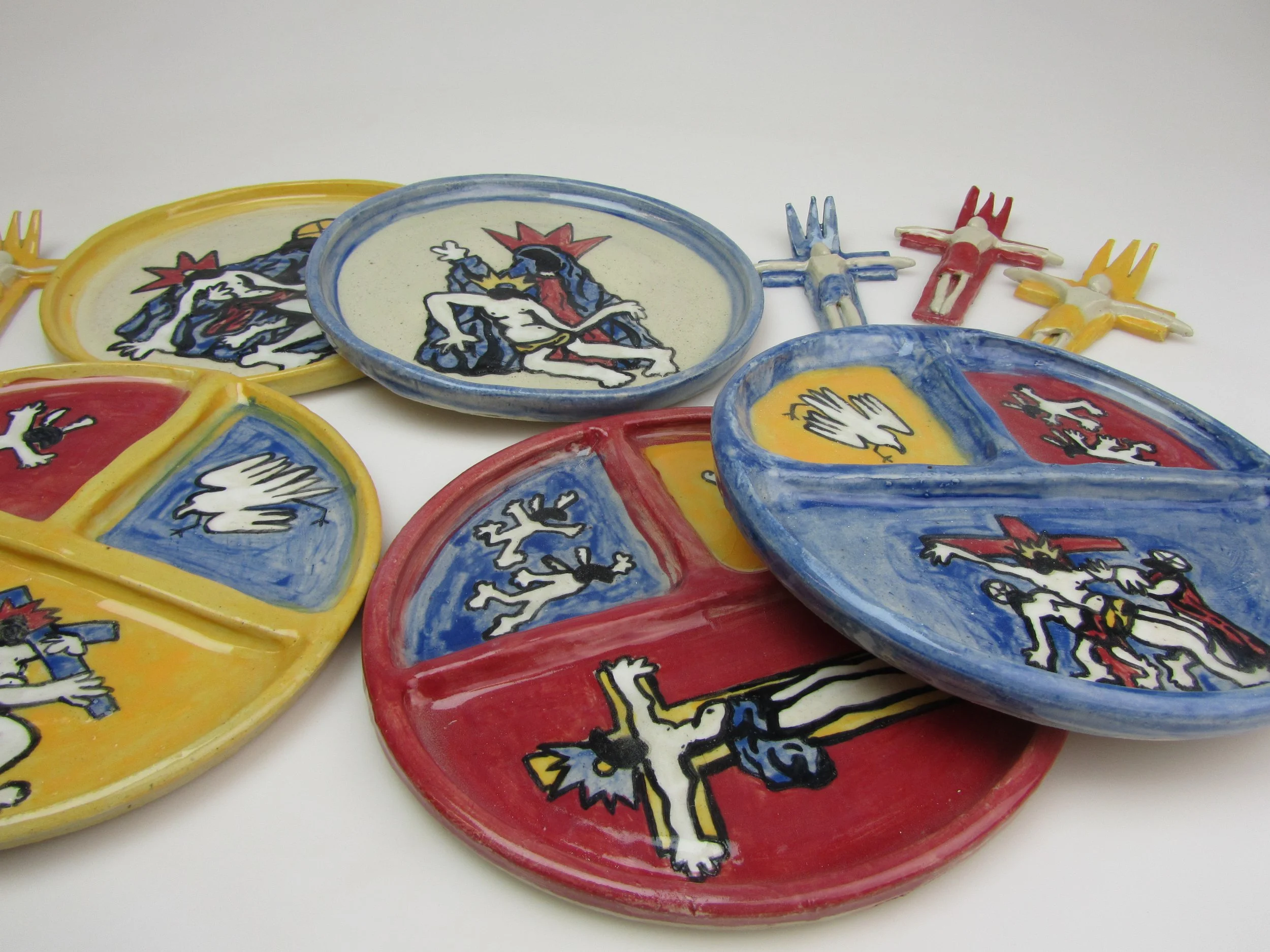 Dinner Setting, 1955 calls back the American Ideal of the Nuclear Family, using a classical dinner setting with two parents and children’ plates with food separators. With these dishes adorned with images of Catholicism, included Crucifix Forks, Dinner Setting 1955 draws attention to the longstanding interwoven history of consumeristic American ideals and the Catholic Church. The images invoke a feeling of mass production and the vibrant advertising art of the mid 20th century America. The piece portrays Jesus, and other symbols of the Catholic Church, as consumeristic icons rather than divine beings.