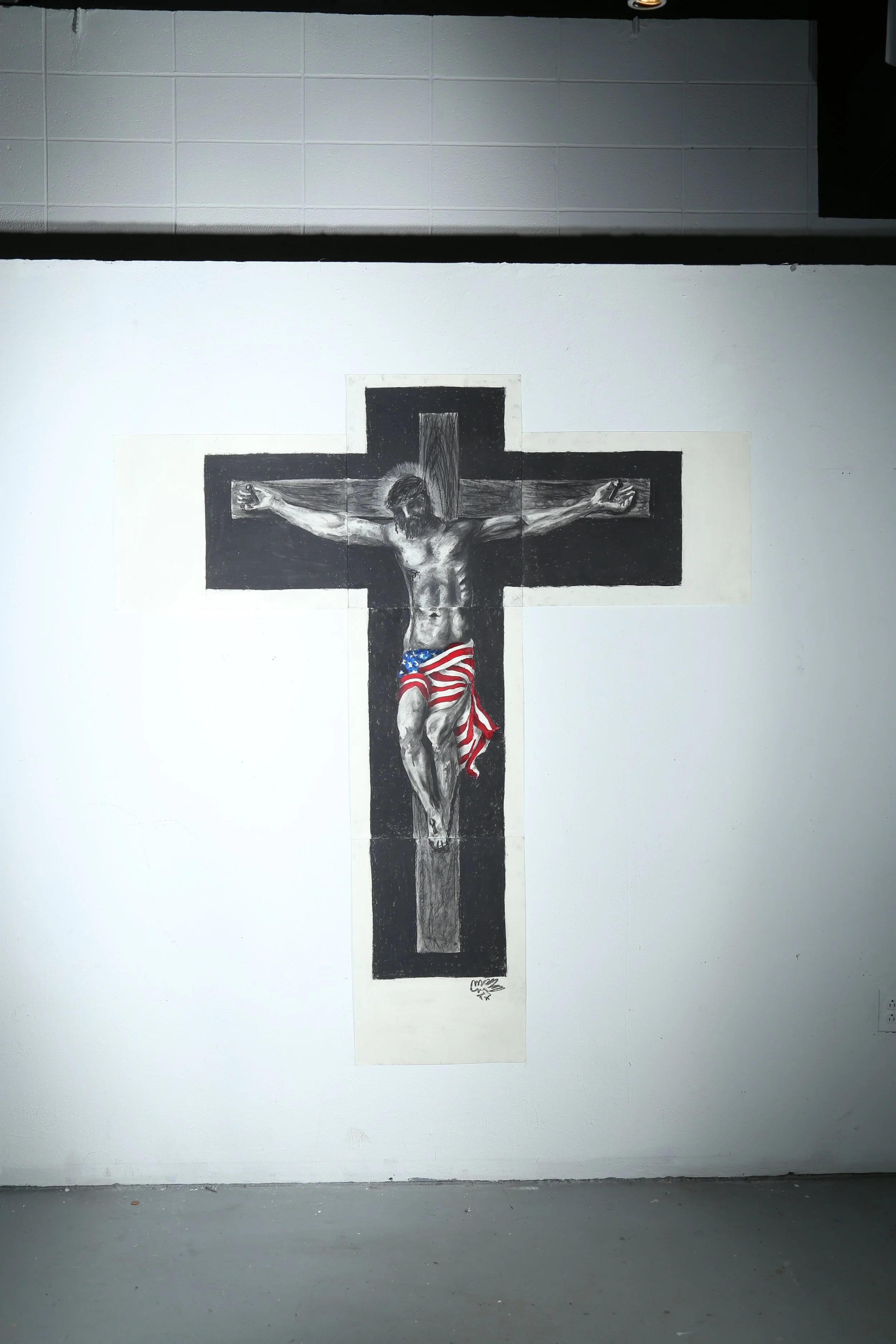 God Bless America (Obviously) creates an image that aims to shock, confuse, and disrupt the viewer. The piece walks a fine line between thoughtful critique of Christianity’s deep role in American Nationalism, and a MAGA Facebook post.